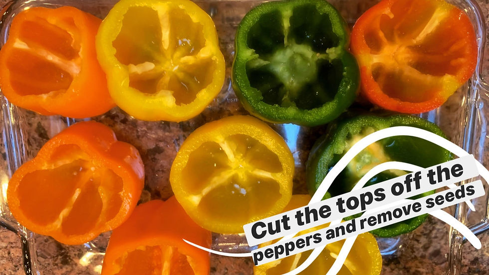2. Cut the tops off the peppers (keep the tops for later step) and remove the seeds. Then microwave for 3-5 minutes until they start to soften.